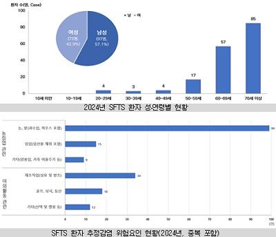 2024년 발생한 SFTS 환자 170명 중 남성이 57.1%(97명)로 높았으며, 60세 이상이 83.5%(142명)를 차지했다.