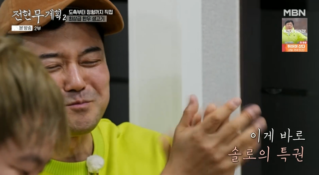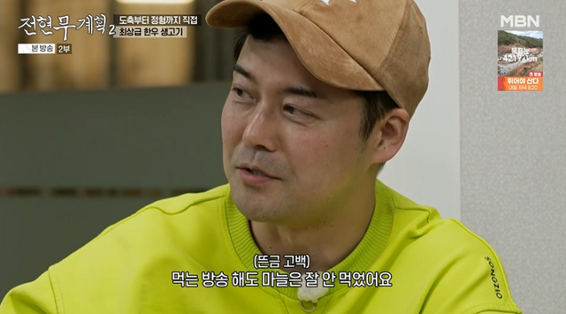 이날 김대호가 한우 생고기를 묵은지와 마늘과 함께 먹으려 하자 전현무는 “진짜 혼자인가보다”라고 연애 여부를 유추했다.