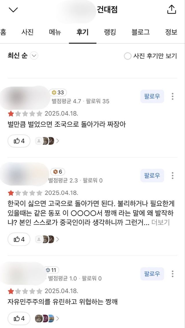 행진 이후 온라인상 해당 음식점 리뷰에 ‘별점 테러’가 이어지고 있다. 사용자들은 최저점인 별점 1점을 남기며 ‘자유민주주의를 유린하고 위협하는 짱X’ 등의 글을 남겼다.
