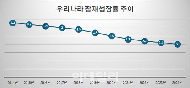 2014년 3.3% 수준이던 잠재성장률은 문재인 정부 들어 2018년 2.9%로 떨어졌고 윤석열 정부가 출범한 2022년엔 2.2%로 하락했다. 2024년엔 2.0%까지 추락하며 올해는 1%대로 하락할 위기에 처해있다. 2014~2024년 평균 잠재성장률은 2%중반대로 현대경제연구원이 예측한 비관적 시나리오에 해당했다.