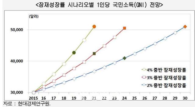 우리나라가 1인당 GNI 3만 달러를 넘어선 직후인 2015년 1월 2일 현대경제연구원은 ‘5만 달러 국가의 조건’이란 보고서를 발표해 눈길을 끌었다. 현대경제연구원은 이 보고서에서 잠재성장률 시나리오별 1인당 GNI 전망을 통해 5만 달러 달성 시점을 2024년으로 예측했다. 가장 비관적인 시나리오를 적용하더라도 2030년엔 5만 달러를 넘길 것으로 내다봤지만, 결과는 4만 달러도 넘지 못하고 있다.