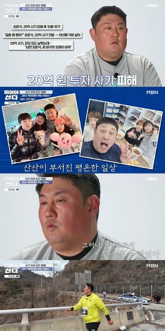 이날 전 야구 선수 최준석이 등장했다. 그는 과거 20억 원대의 투자 사기 피해를 입었다고 밝히며 "가족들에게 미안한 부분이다. 가족들이 앞으로 어떻게 살아야 되는 지에 대한 건 내가 책임져야 되는 게 크다"며 가족들을 향한 미안함을 내비쳤다.