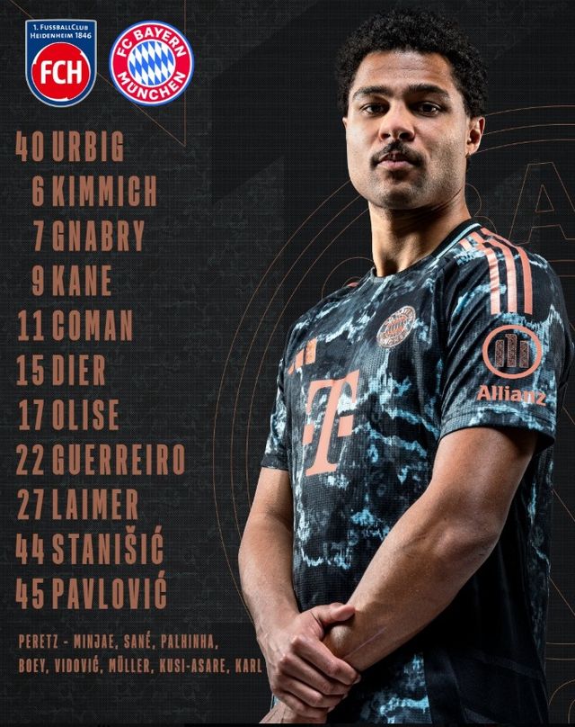 바이에른 뮌헨은 19일(한국시간) 오후 10시30분 독일 하이덴하임에 위치한 포이트 아레나에서 하이덴하임과 2024-25시즌 분데스리가 30라운드 원정 경기를 앞두고 선발 라인업을 발표했다.