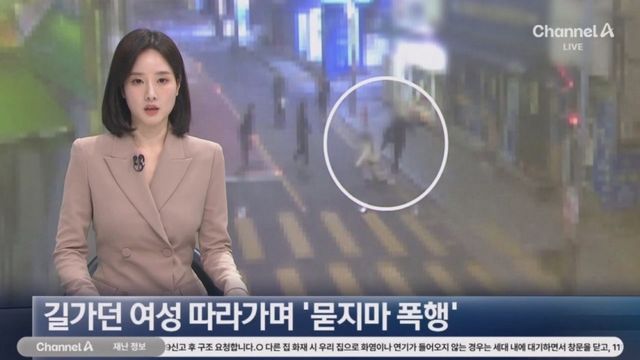 당황한 여성은 이리저리 피하다 넘어졌고, 남성은 여성을 붙잡아 넘어뜨리고 발로 걷어찹니다.