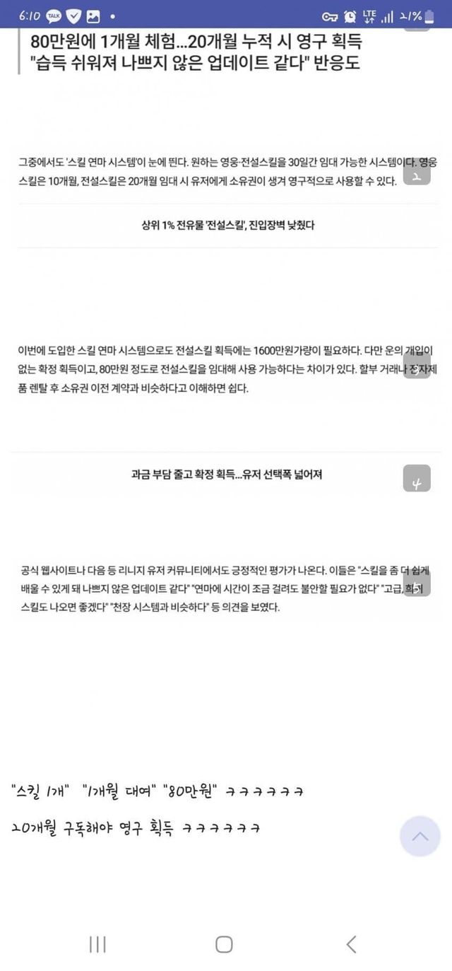 20개월 동안 1600만원 태우면 전설스킬 획득근데 반응이 나쁘지 않음 ㅋㅋㅋ