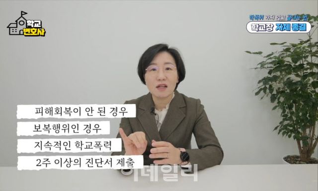 김영미 변호사는 “학교장 자체 종결을 할 수 없는 사유가 법에 명확히 규정돼 있다”고 설명했다. 자체 종결이 불가능한 경우로는 △2주 이상의 진단을 받고 진단서를 제출했을 때 △학교폭력이 지속적인 경우 △보복 행위인 경우 △재산상 피해나 신체적 피해가 발생했는데 피해 회복이 안 된 경우가 있다. 이 4가지 요건에 해당하지 않으면 학교장 자체 종결이 가능하다. 그러나 가장 중요한 조건이 하나 더 있다.