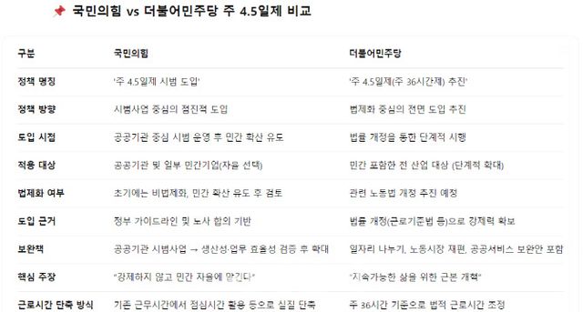 국민의힘은 ‘현행 주 40시간 근로시간을 유지하면서 시범사업 중심의 자율 도입’을, 민주당은 ‘주당 근로시간을 36시간으로 단축하는 법제화를 통한 구조적 개편’을 내세우고 있다. 국민의힘은 제도의 유연성과 민간 수용성을 우선한데 비해 민주당은 법적 강제력을 기반으로 4.5일제 의무화가 목표다.