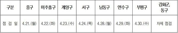 합동 단속은 4월 21일 중구를 시작으로 미추홀구, 계양구, 서구, 남동구, 연수구, 부평구 순으로 진행되며, 강화군과 동구는 자체 점검 방식으로 진행될 예정이다.