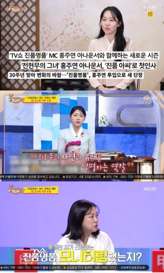 홍주연은 '진품명품'에서 의뢰품의 사연과 유래를 설명하는 역할을 맡고 있었다.