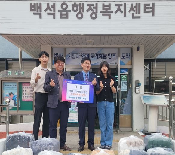 [와이뉴스] 양주시 백석읍가 지난 18일 관내 양말 제조 전문기업 ‘다움’에서 이웃들을 위해 1만 켤레의 양말을 기부했다고 밝혔다.