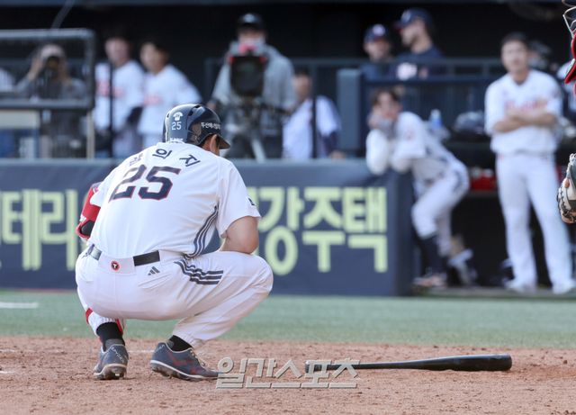 낮은 쪽으로 향한 걸 한승택이 겨우 잡았는데 ABS는 이 직구가 스트라이크존을 통과했다고 판정, 심판의 루킹 삼진 콜이 나왔다. 당황한 탓일까. 양의지는 배트를 놓친 뒤 그라운드에 주저앉았다. 1군에서 7000타석 가까이 소화한 베테랑으로서 경기 중 좀처럼 보기 힘든 모습이었다.