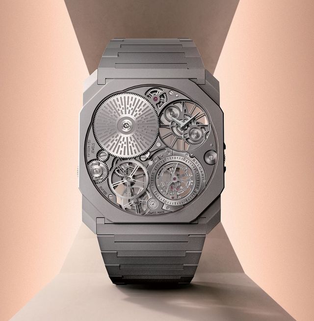 」불가리는 올해 워치스앤원더스에 첫발을 내딛었다. 데뷔전인 만큼 많은 이들이 주목할 만한 신작을 준비했다. 바로 옥토 피니씨모 울트라 투르비용이다. 케이스 두께는 단 1.85mm. 동전만큼 얇은 이 시계는 2mm란 종전 기록을 따돌리고 곧장 세계에서 가장 얇은 투르비용 시계로 등극했다. 불가리는 이로써 그 어렵다는 울트라-씬 워치메이킹에서 열 번째 월드 레코드를 기록하게 됐다. 얇은 시계를 만드는 데 독보적인 불가리답게, 신제품 역시 뛰어난 기술력이 돋보인다. 모든 부품을 최대한 얇게, 수평으로 배치하는 한편, 울트라-씬의 약점인 내구성은 텅스텐 카바이드라는 신소재로 해결했다. 스틸보다 2배 이상 단단한 이 소재는 무브먼트 부품을 지지하는 메인 플레이트이자 케이스백으로 쓰인다. 2시 방향 다이얼, 5시 방향 투르비용에 맞춰 각 부분을 정교하게 오려낸 것 역시 탁월하다. 덕분에 이 시계의 백미인 투르비용이 공중에 떠서 휘몰아치는 듯한 황홀경을 연출한다. 이는 오직 극도로 얇은 시계에서만 경험할 수 있는 흔치 않은 퍼포먼스다. 샌드 블라스트 티타늄 케이스 지름은 40mm, 20점 한정 생산한다.