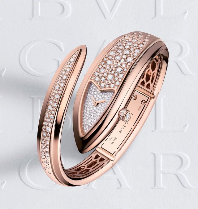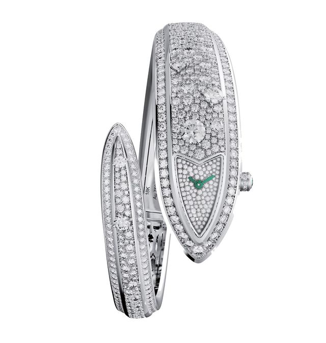 」영원과 풍요를 상징하는 뱀은 불가리에게 소중한 영물이다. 아이코닉한 세르펜티에 끊임없는 영감을 제공하고 있기 때문이다. 세르펜티는 그를 바탕으로 1948년부터 변신에 변신을 거듭해오고 있다. 푸른 뱀의 해를 맞은 2025년에도 이 흐름은 계속된다. 기존 컬렉션의 베리에이션이 이어졌던 지난 몇 년과 달리, 이번에는 세르펜티 에테르나라는 완전히 새로운 컬렉션이 허물을 뚫고 나왔다. 세르펜티 에테르나는 이전과는 결이 다르다. 뱀의 눈이나 비늘, 그 어떤 직접적인 묘사가 없다. 남겨진 건 가장 근본적인 뱀의 형태뿐. 갓 탈피한 뱀이 그대로 주얼리 워치가 된 듯하다. 다이얼이 위치한 날렵한 머리부터 길쭉한 꼬리로 갈수록 점점 가늘어지는 형태다. 손목을 단단히 감싸는 묵직한 뱅글 타입이라 그런지 세르펜티 역사상 가장 간결한 디자인임에도 전에 없던 힘이 느껴진다. 유려한 곡선을 따라 빼곡히 늘어선 다이아몬드는 각기 다른 크기로 서로가 서로를 반사하며 화려한 빛을 내뿜는다. 다이아몬드를 세팅한 로즈 골드 모델, 다이아몬드가 더욱 화려하게 세팅된 풀 파베 화이트 골드 하이 주얼리 모델 두 가지로 선보인다.