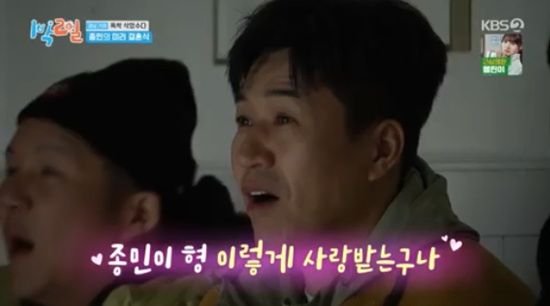 김종민은 눈시울이 붉어진 얼굴이었다. 멤버들은 "우리가 더 울었다"면서 눈물을 닦아냈다.