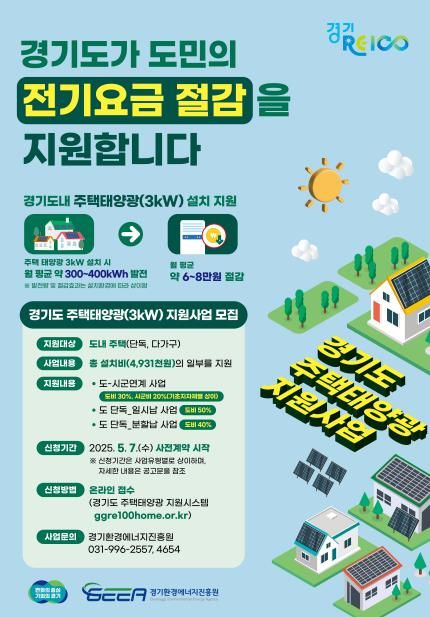 김연지 경기도 에너지산업과장은 “경기도는 예산을 대폭 확대하고, 분할납 등 유연한 지원방식을 도입해 도민의 참여 문턱을 크게 낮췄다”며 “전기요금 부담을 줄이고 에너지 자립을 실현하는 이번 주택태양광 지원사업에 많은 도민들이 관심 갖고 참여해 주시길 바란다”고 말했다.