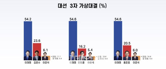 이 후보는 김문수(23.6%) 국민의힘 후보, 이준석(6.1%) 개혁신당 후보와의 가상 3자 대결에선 54.2%로 앞섰다. 한동훈(16.2%) 국민의힘 후보와 이준석(5.4%) 개혁신당 후보와의 가상 3자 대결에서 이 후보는 54.6%를 기록했다. 홍준표(20.5%) 국민의힘 후보와 이준석 개혁신당 후보와의 대결에서도 이 후보는 54.6%로 집계됐다.