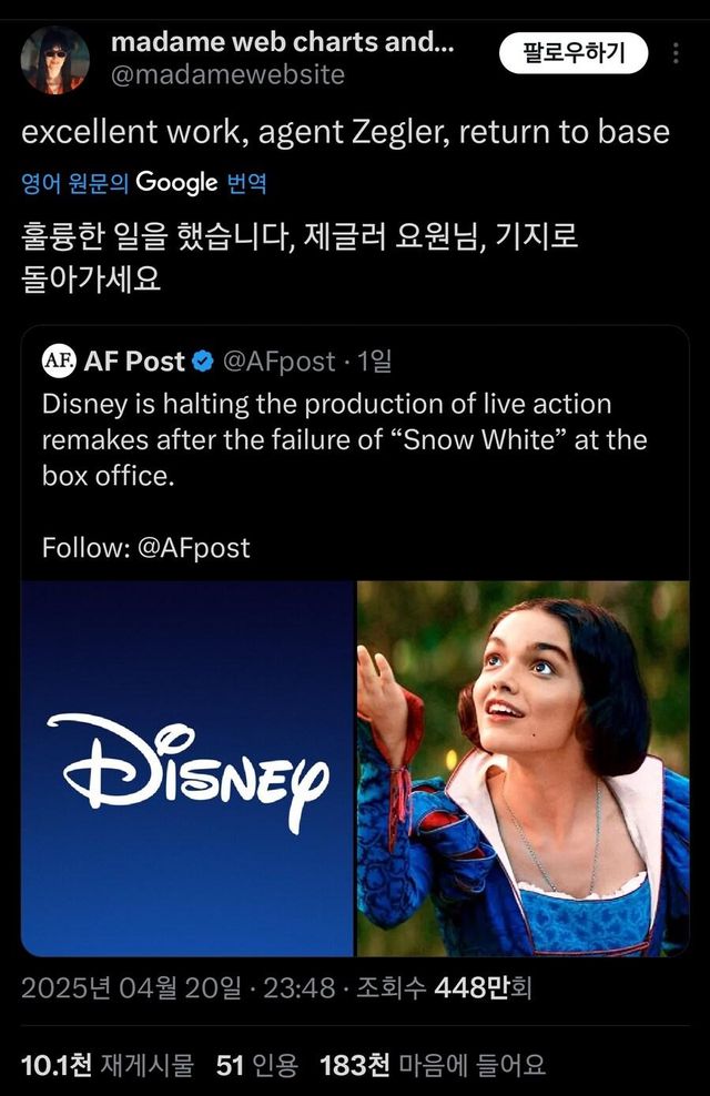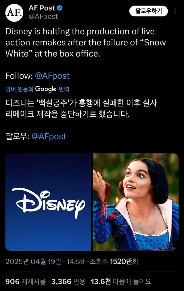 백설공주 조지고마침내 개좆같은 실사화 리메 제작 더 안하겠다고 선언해서 ㅋㅋㅋㅋ
