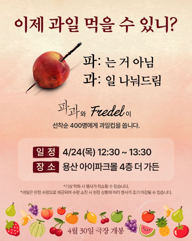 ‘파과’는 고품질 과일 큐레이션을 선보이는 F&B 기업 프레델과 함께 과일컵 나눔 이벤트를 선보인다. 오는 24일(목) 용산 아이파크몰 4층 더 가든에서 선착순 400명에게 당일 공수한 신선한 과일컵을 제공하며 영화 홍보에 나설 예정이다. 영화 제목인 ‘파과’는 ‘부서지거나 금이 간 과일’을 의미하는 동시에 주인공인 ‘조각’을 상징하는 주요한 단어다. 제목에서 파생된 이번 이벤트는 과일 배송 서비스를 진행하는 프레델과의 긴밀한 협업을 통해 제목의 의미를 예비 관객들에게 각인할 예정이다. 또한, 일정 기간 동안 주문한 고객에게 배송된 ‘파과’ 스페셜 전단에는 ‘파과’에 대한 내용과 함께 예매권 이벤트에 참여할 수 있는 QR코드가 삽입되어 있어 많은 고객들의 흥미를 모았다.