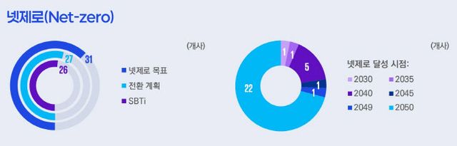 기후 관련 공시의 경우 분석 대상 기업 대부분이 비교적 체계적으로 준비된 모습을 보였다. 이미 기후변화 관련 재무정보공개 협의체(TCFD) 및 온실가스(GHG) 프로토콜에 기반한 기후 공시를 시행하고 있으며, 이 중 62%가 넷제로(Net-zero) 목표를 설정했다. 86%는 물리적 리스크와 전환 리스크를 포함한 시나리오 분석 정보를 공개했고, 대부분 이를 기업 전략에 통합해 설명했다.