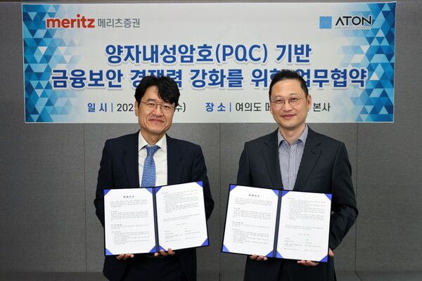 아톤은 메리츠증권과 양자내성암호(PQC) 기반의 금융보안 강화를 위한 전략적 업무협약(MOU)을 체결했다고 21일 밝혔다.