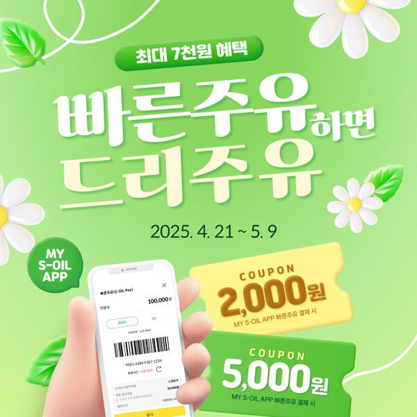 이번 프로모션은 S-OIL의 간편결제 서비스인 MY S-OIL 앱 ‘빠른주유’ 기능을 통해 4만원 이상 주유 결제한 고객을 대상으로 하며, 최초 이용자에게는 7천원(2천원 + 5천원), 기존 이용자에게는 2천원 주유쿠폰이 제공된다.