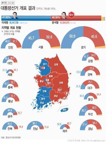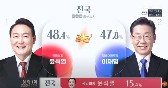 지난 대선일인 2022년 3월9일 투표 시간이 종료되고 출구조사 결과가 나오자마자 국민의힘 당사가 얼어붙었다. KBS·MBC·SBS 등 방송 3사가 진행한 사전투표 결과는 윤 전 대통령 48.4%, 이 전 대표 47.8%로 0.6%p 차이에 불과했다. 자체적으로 출구조사를 진행한 JTBC 결과는 윤 전 대통령 47.7%, 이 전 대표 48.4%로 0.7%p 차이였다.