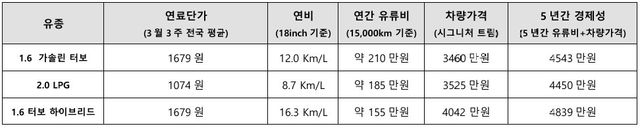 반면, 차량을 5년간 탄다고 가정했을 때, 차량 가격과 5년간 유류비를 고려하면, 가장 경제적인 차량은 LPG > 가솔린 > 하이브리드 순으로 바뀐다. 따라서 자신이 연간 1만5000km 이상을 주행하는지, 차량을 구입하면 얼마나 오래 탈 것인지를 고려해 차량 연비와 총 구매 가격, 연간 유지비와 5년간 유지비 등을 계산해 비교할 필요가 있다.