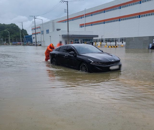 소방대원들이 집중호우로 침수된 차량을 밀어서 이동하는 모습 / 출처=소방청