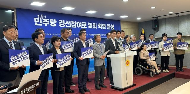 더불어민주당 문대림 국회의원(제주시 갑)과 이상봉 도의회 의장 등 민주당 소속 의원들은 21일 도의회 도민 카페에서 회견을 열어 "압도적인 정권 교체만이 대한민국의 안정과 국민 통합을 이루고, 경제 성장과 민생 회복을 가능하게 할 것"이라며 이같이 밝혔다.