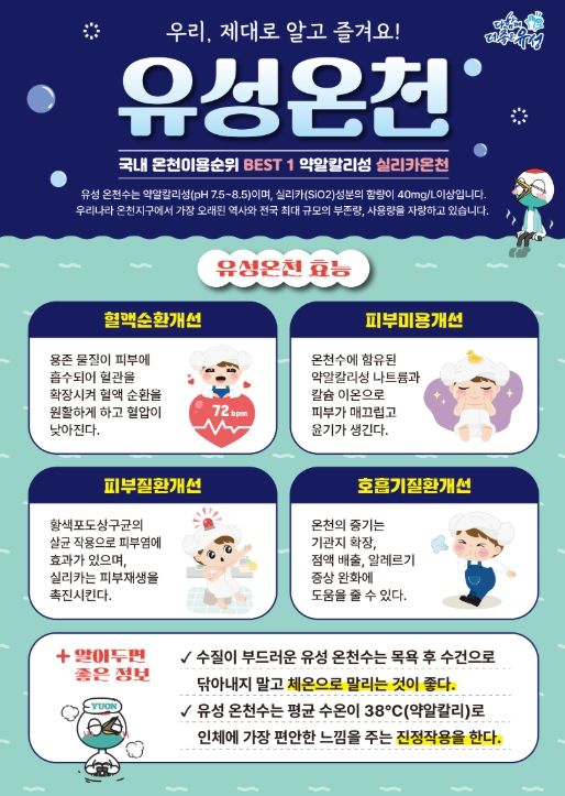 함께 배포되는 홍보물은 유성온천수의 효능을 한눈에 알 수 있도록 간결하고 보기 쉽게 제작했으며, ‘온천 활용 꿀팁’도 함께 담아 이용객들의 흥미를 끌 예정이다.