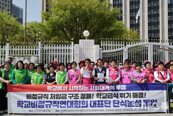 전국학교비정규직연대회의(학비연대) 대표단이 저임금 등 열악한 처우 구조 개선을 요구하며 단식 농성에 돌입했다.