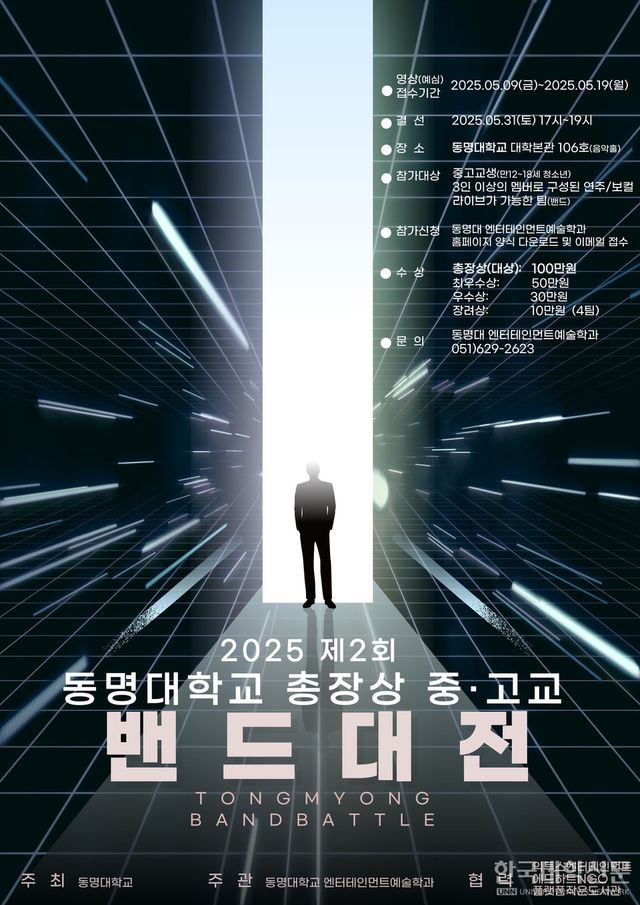 [한국대학신문 이용현 기자] 동명대학교(총장 이상천) 엔터테인먼트예술학과(학과장 이우영)는 영예의 대상에 1백만원의 상금 등이 주어지는 글로벌 음악축제 ‘2025 제2회 동명대학교총장상 중·고교 밴드대전’을 오는 5월 31일 개최한다고 밝혔다.