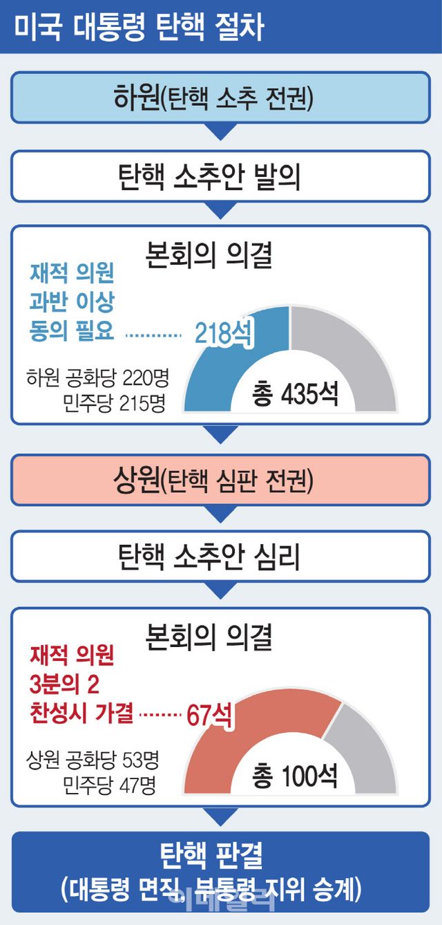 하원 본회의를 통과하는 것도 쉽지 않다. 과반 이상 찬성을 얻어야 하는데, 현재 하원은 공화당(220명) 의원 수가 민주당(215명)보다 많다. 하원에서 탄핵소추안이 가결되더라도 상원 문턱을 넘는 건 더욱 어렵다. 인용을 위해선 100명의 의원 중 3분의 2, 즉 67명 이상의 찬성표를 받아야 하기 때문이다. 현재 상원 역시 공화당(53명) 의원 수가 민주당(47명)보다 많다. 이는 공화당에서 이탈표가 최소 20표 나와야 한다는 의미다.