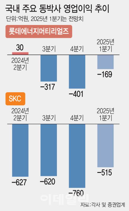 21일 증권정보업체 에프앤가이드에 따르면 롯데케미칼(011170)의 동박(전지박) 자회사인 롯데에너지머티리얼즈(020150)의 올해 1분기 실적 전망치는 매출 1827억원, 영업손실 168억원으로 집계됐다. 롯데에너지머티리얼즈는 지난해 3분기부터 올해 1분기까지 3분기 연속 적자를 이어갈 전망이다.