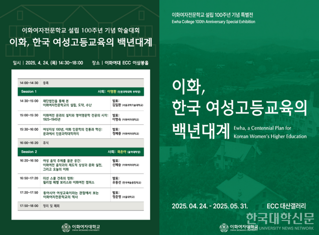 [한국대학신문 이정환 기자] 이화여자대학교(총장 이향숙)는 ‘한국 최초의 여자전문학교’인 이화여자전문학교 설립 100주년을 기념하며 <이화, 한국 여성고등교육의 백년대계> 라는 주제로 기념예배와 기념전시, 학술대회를 오는 24일(목) 이화여대 ECC에서 개최한다. 이화, 한국 여성고등교육의 백년대계>