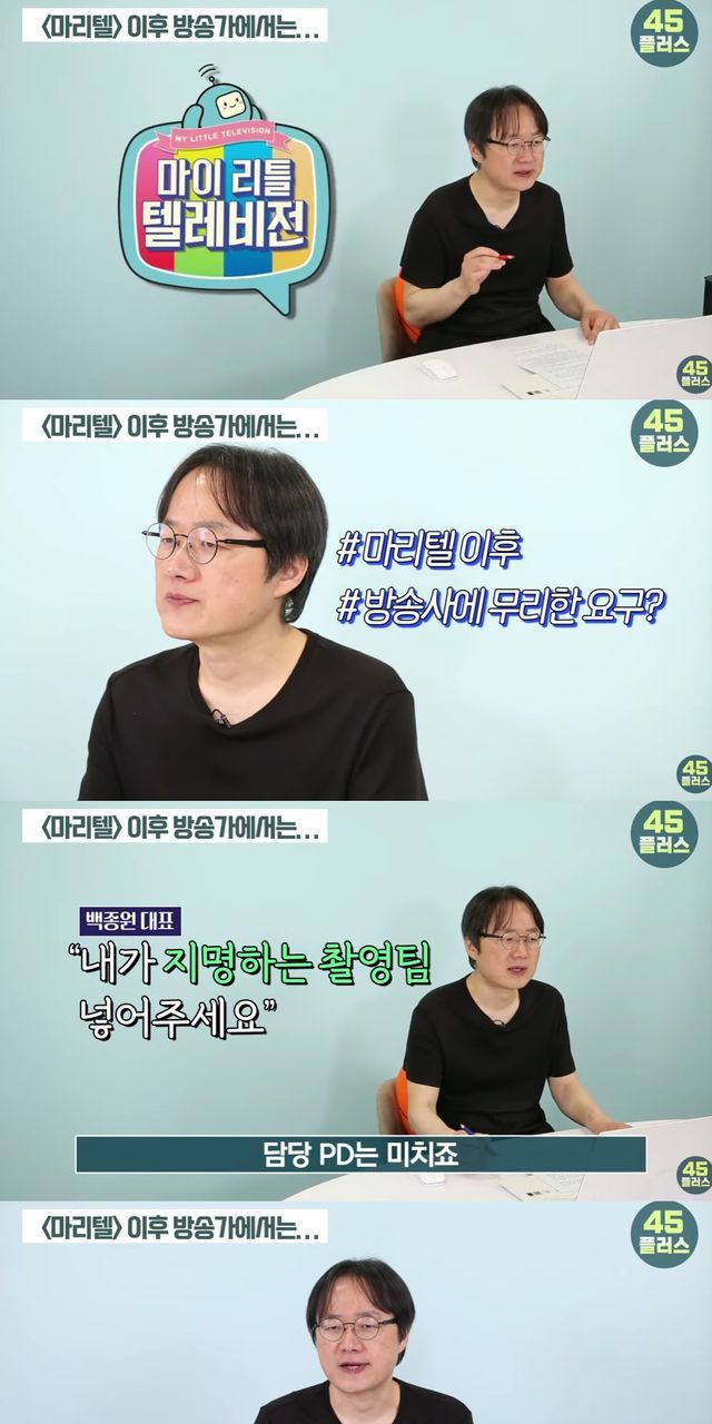 백종원은 '마리텔' 후 방송사에 점점 무리한 요구를 시작했다고 주장한 김재환 감독은 "프로그램에 내가 지명하는 작가팀, 촬영팀을 넣으라고 한다더라. PD는 미친다. 프로그램 분위기는 PD와 촬영팀 호흡이 중요한데, 백종원이 데려 온 촬영 팀이 백 대표 심기만 살피면 현장 권력은 백종원에게 쏠린다"고 이야기했다.