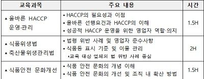 교육 내용은 ▲올바른 해썹 운영․관리 ▲식품 관련 법령 ▲식품 안전문화 개선이며, 해썹 관리는 물론 식품 안전 문화 현장 정착 방안과 주요 법령 위반 사례, 표시 기준, 이물 관리, 영업자 준수사항 등이다.