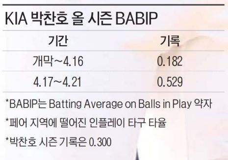 그의 불운은 기록에서도 확인된다. 야구통계전문업체 스포츠투아이에 따르면, 지난 16일까지 박찬호의 BABIP(Batting Average on Balls in Play)는 0.182이다. 이는 최소 45타석을 소화한 KBO리그 85명의 타자 중 최저. BABIP는 홈런이나, 삼진, 볼넷을 제외하고 페어 지역에 떨어진 인플레이 타구의 타율을 의미하는데 수치가 평균에 얼마나 수렴하느냐에 따라 다른 평가가 가능하다. 좋은 타구를 날려도 호수비에 걸리면 BABIP가 낮아지는데 박찬호의 경우가 여기에 해당하는 셈이다. 리그 평균(0.316)은 물론이고 지난 시즌 개인 기록(0.324)과도 차이가 꽤 컸다.