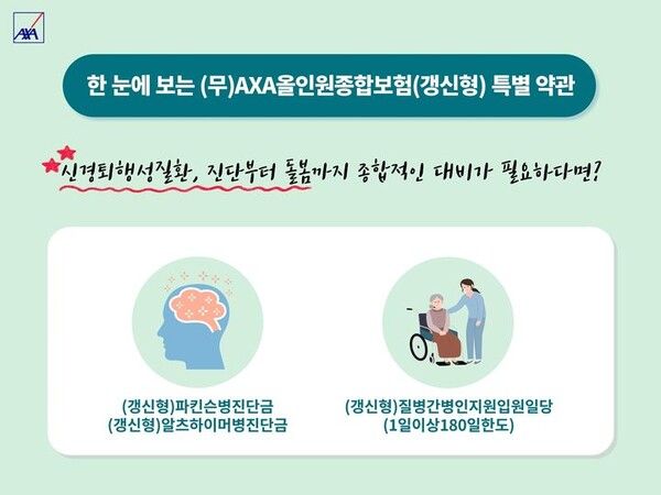 악사손해보험의 AXA올인원종합보험(갱신형)은 보험 기간 중 파킨슨병으로 진단 확정된 경우 최초 1회에 한해 진단금을 지급한다. 알츠하이머병으로 진단 확정된 경우에도 최초 1회 진단금을 보장해 양대 노인질환에 대비할 수 있다.