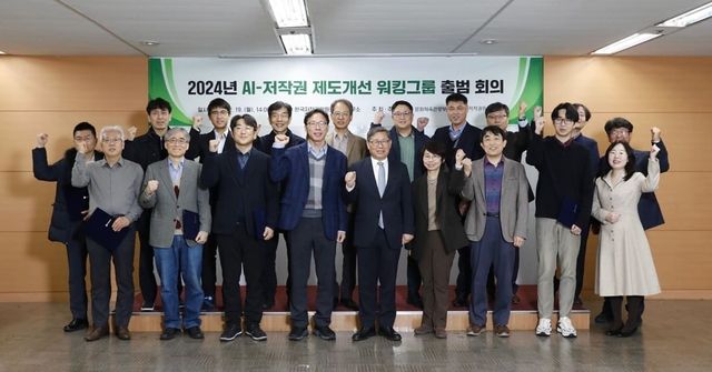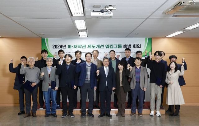 지난해 미국상공회의소 산하 글로벌혁신정책센터(GIPC)가 올해 발표한 국제지식재산지수(IP Index)에서 우리나라가 3년 연속 저작권 분야 세계 7위에 오른 기념으로 전병극 문화체육관광부 제1차관이 서울 용산구 한국저작권위원회 서울사무소에서 열린 2024 AI 저작권 제도개선 워킹그룹 발족 회의에서 참석자와 기념촬영을 하고 있다./ 문화체육관광부 제공
