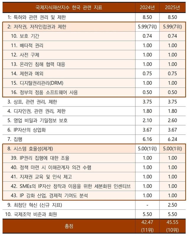 문화체육관광부는 글로벌혁신정책센터(GIPC, Global Innovation Policy Center)가 발표한 2025 국제지식재산지수(IP Index)에서 대한민국이 4년 연속 저작권 분야 세계 7위에 올랐다고 밝혔다.