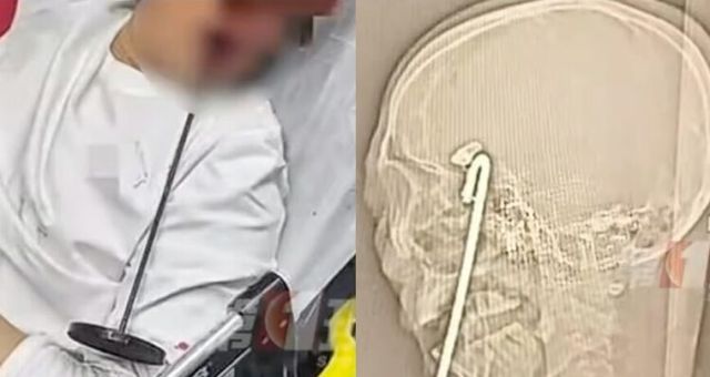 중국의 한 남성이 술 취해 넘어져 쇠막대가 머리를 관통했는데 기적적으로 목숨을 건졌다.