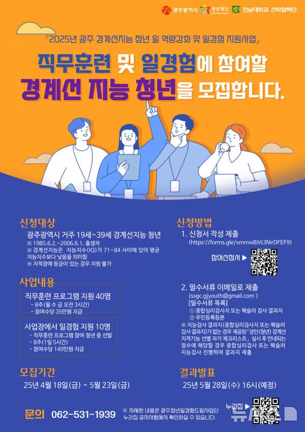 1기 훈련생으로 참여를 희망하는 청년은 다음 달 23일까지 신청서와 종합심리검사 또는 웩슬러지능검사 결과지 등을 제출하면 된다. 자세한 내용은 전남대학교 산학협력단(광주청년 일경험드림사업단) 누리집에서 확인할 수 있다.