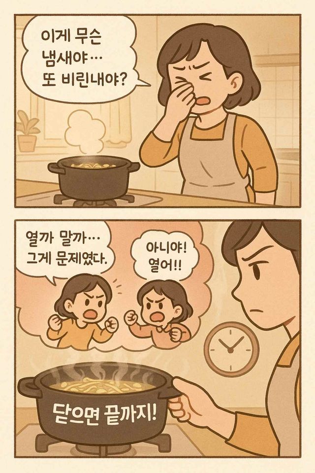 이때 콩나물의 비린내를 줄이는 방법은 간단하다. 열 거면 처음부터 끝까지 열고, 닫을 거면 절대 열지 않아야 한다. 삶는 도중에 뚜껑을 열었다 닫는 순간, 잡내가 빠져나가지 못하고 다시 음식 안에 갇히게 된다. 이게 바로 비린내의 핵심 원인이다. 뚜껑을 열고 삶으면 냄새가 날아가고, 닫은 채로 익히면 수증기로 익으면서 냄새가 퍼지지 않는다. 중간에 열었다 닫는 건 가장 피해야 할 행동이다.