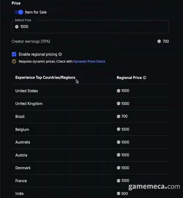 로블록스에서 활동하는 제작자는 콘텐츠를 판매해 로벅스를 벌고 있다. 그리고 로벅스를 통해 돈을 버는 방식이다. 지역별 가격 책정은 각 지역에 맞춰 로벅스를 자동으로 설정하는 기능이다. 예를 들어 미국 가격을 1,000 로벅스로 결정했다면, 브라질에는 700 로벅스, 인도에는 500 로벅스로 책정된다. 아이템을 구매할 사용자들이 현지 경제 상황이 반영된 가격으로 살 수 있다.