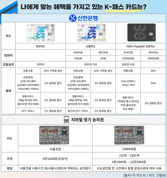 신한카드의 경우 신한은행에서 내놓은 K-패스 카드를 제외하고 또 다른 카드인 '티머니 Pay & GO 신한카드'가 있다. 다른 카드와 달리 교통비 할인에 최적화된 카드로 전월 실적 30만원을 쌓으면 K-패스 환급액 외에도 대중교통 30%, 고속/시외버스·킥보드·택시 등에서 20% 할인을 제공받을 수 있다. 백화점·편의점·통신·카페 등 생활 영역에서도 5% 할인을 받을 수 있다.