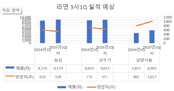반면 삼양식품은 1분기 영업이익과 매출액이 각각 1017억원, 4902억원으로 전년 동기대비 모두 27%씩 증가했을 것으로 관측된다. 강은지 한국투자증권 애널리스트는 “불닭볶음면 수출 물량 증가로 매출액이 증가하며 높은 수익성이 유지됐을 것”이라며 “최근 상승한 원달러 환율 또한 해외 매출액 비중이 높은 삼양식품에는 긍정적”이라고 했다. 삼양식품 추정 올 1~2월 월평균 라면 수출 금액은 7455만달러로 지난해 1분기 월평균 대비 34% 증가했다.
