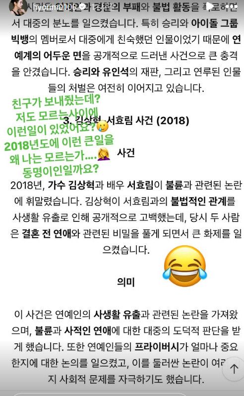 공개된 사진에는 김상혁과 서효림의 불륜설 내용이 담긴 캡쳐본이 담겼다. "3. 김상혁 서효림 사건(2018) 2018년 가수 김상혁과 배우 서효림이 불륜과 관련된 논란에 휘말렸습니다. 김상혁이 서효림과의 불법적인 관계를 사생활 유출로 인해 공개적으로 고백했는데, 당시 두 사람은 결혼 전 연애와 관련된 비밀을 풀게 되면서 큰 화제를 일으켰습니다"라는 글이 담겼다.