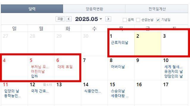 현재 관심이 집중되는 건 5월 2일 목요일이다. 해당 날짜가 임시공휴일로 지정될 경우, 5월 1일부터 6일까지 최장 6일의 황금연휴가 만들어진다. 하지만 정부는 아직 5월 2일에 대한 임시공휴일 지정 여부를 공식 발표하지 않았다.