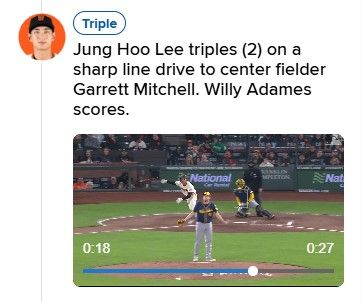 첫 세 타석에서 침묵한 이정후는 샌프란시스코가 3-2로 앞선 7회 말 2사 2루에서 좌완 투수 제러드 케이닉을 상대로 우중간을 가르는 3루타를 쳤다. 볼카운트 1볼-0스트라이크에서 2구째 93.1마일(149.8㎞/h) 싱커를 잡아당겨 오라클 파크 외야 가장 깊은 위치 근처로 공을 보냈다. 타구 속도는 무려 102.2마일(164.4 ㎞/h)이었다.